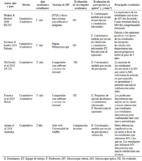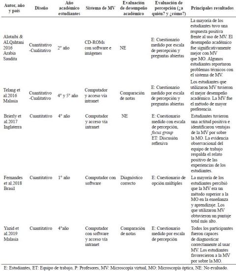 La MV en educación se presenta como una herramienta sencilla de utilizar, aplicable en diversos contenidos multimedia, que otorga mejor discernimiento de los tejidos y acceso remoto para acceder a esta en horarios de estudio (1,2). Su implementación hace cuestionar si en el tiempo reemplazará la MO. Así, el objetivo de este artículo es proporcionar una revisión de la literatura a partir de las preguntas de investigación: ¿Cuál es la percepción de académicos y estudiantes? y ¿Cuál es el desempeño de los estudiantes? respecto a la enseñanza de histología y/o histopatología en odontología con MV.