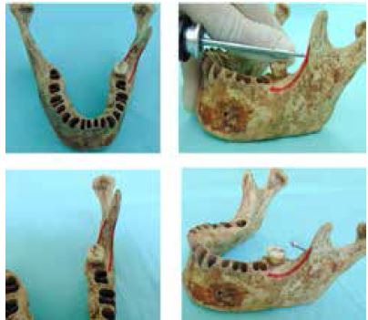 Con relación a la verticalización de diente 48, inicialmente la planificación del procedimiento se realizó en modelo de estudio cadavérico humano, teniendo como referencias anatómicas: rama mandibular, líneas oblicuas interna y externa y canal del nervio dentario inferior, con el fin de determinar profundidad y angulación del minitornillo.