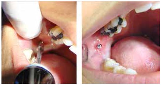 Para la cirugía se realizó bloqueo anestésico con la técnica mandibular, colocación de minitornillo (Bioray A-1) 2,0x14mm, con perfil transmucoso alto, utilización de conductor de mano con un (Long blade) de 78mm y un (Rotatable handle) de 100 mm, entre la línea oblicua externa e interna de la mandíbula, a una altura de 2 cm, por encima de la cara oclusal del diente 47, atornillando lentamente hasta obtener estabilidad primaria (figura 3).