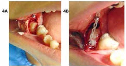 Luego, se realizó incisión festoneada lineal, desprendimiento del colgajo y leve osteotomía circunferencial en el diente 48 con fresa quirúrgica 701 para pieza de alta, con el fin de disminuir el factor retentivo óseo y favorecer el movimiento del diente hacia distal. Posteriormente, ubicación de botón ortodóntico para tracción en la cara vestibular del diente 48, y colocación de cadeneta elástica del botón ortodóntico al mini tornillo. Finalmente, hemostasia y aplicación de punto simple (figura 4 (A y B)).
