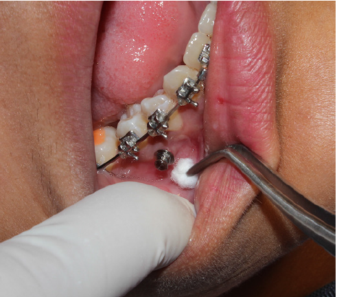 This descriptive longitudinal study was conducted after the approval of the Ethics Committee (document number R-84-19-15). Informed consent or assent was obtained from the patients and the consent of the parents in case they were minors, according to the institutional protocol, confidentiality mechanisms of clinical data were also contemplated. Eight patients between 14-50 years comprised the study sample. The inclusion criteria were a healthy systemic condition, non-pregnant women, no use of anti-inflammatory drugs one week preceding the start of the study, and no radiographic evidence of periodontal bone loss. The patients required the use of miniscrews (Dewimed-Germany) according to their orthodontic treatment plan making a total sample of 10 miniscrews (figure 1). Patients received oral hygiene instructions after the placement of orthodontic appliances.