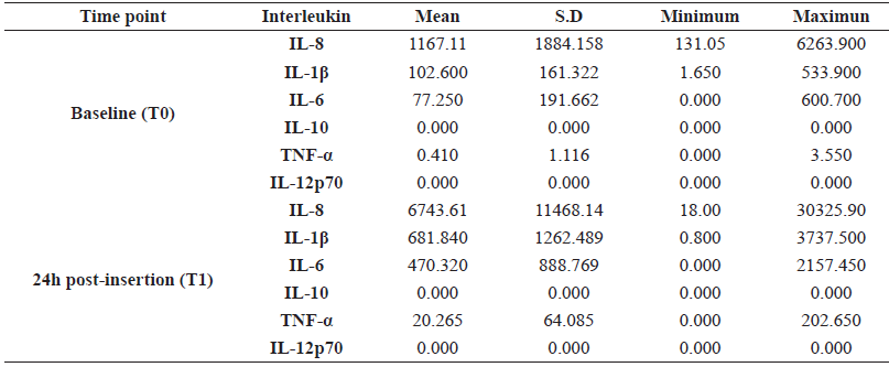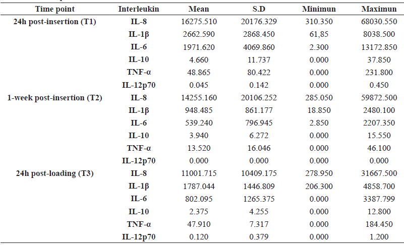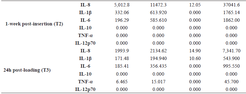 The levels of inflammatory mediators in the peri-implant crevicular fluid at 24 hrs. post-insertion (T1) of the 10 miniscrews had the following order of mean values: IL-8 (16275.51 pg/mL)>IL-1β (2662.59 pg/ mL)>IL-6 (1871.62 pg/mL)>TNF-α (48.865 pg / mL)>IL-10 (4.66 pg/mL) > IL- 12P70 (0.045 pg/mL). The values found one-week post-insertion (T2) and at 24 hrs. post-loading (T3) are shown in Table 1. In all the samples taken (T1, T2, and T3) IL-12P70 showed the lowest concentration including a value of zero at T2. However, there was an increase at (T3); the previously mentioned hierarchy was maintained. In T2, the values begin to decrease and in T3, after force application, a decrease was observed for IL-8 and IL-10 values while an increase of concentration was found in the rest of the cytokines. The highest values of inflammatory mediators were quantified at 24 hours post-insertion.