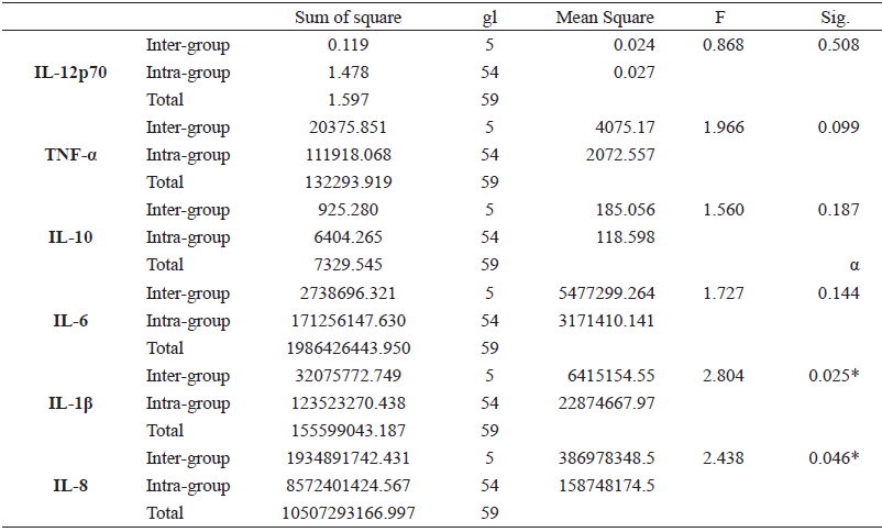 Statistically significant intergroup differences (p <0.05) were found for IL-1β and IL-8 (See Table 3) in the peri-implant crevicular fluid. Subsequently, post hoc tests were carried out to verify these results. The Scheffe test showed that there were no statistically significant differences when performing an intragroup pairwise comparison of the levels of each mediator at a given time. Finally, no statistically significant differences (p <0.05) were found between and within groups for all the inflammatory mediators evaluated in saliva (table 4).