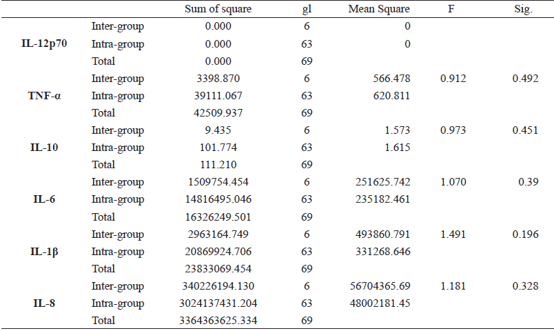 Table 2 shows the levels of inflammatory mediators found in saliva at different time points. It was observed that in T0 (baseline) almost all inflammatory mediators were detected with the exception of IL-10 and IL-12P70. Likewise, at T1 there was an increase in the levels of all mediators except IL-10 and IL-12P70, which were not detected. At T2 the levels began to decrease for IL-8, IL-1β, and IL-6, while IL-10, TNF-α, and IL-12P70 were not detected. Finally, at T3 the mediator levels continue to decrease but TNF-α was detected. As in the values found for peri-implant crevicular fluid, the hierarchy of the concentrations was maintained.