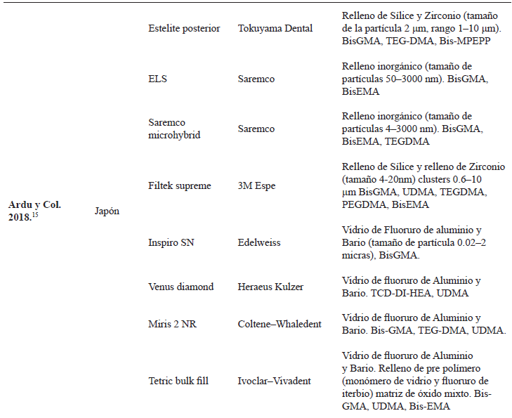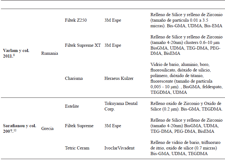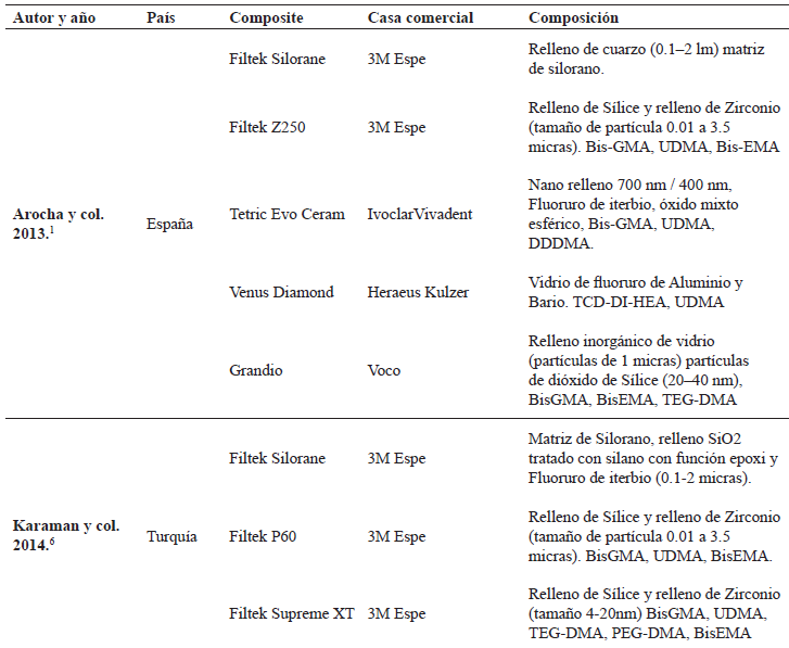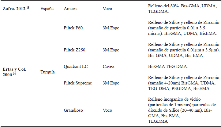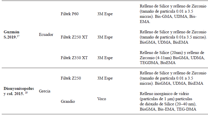 Este estudio evidencia que en las publicaciones analizadas el material más empleado fueron las resinas compuestas de la marca 3M Espe entre estas tenemos la Filtek Supreme, Filtek P60, Filtek Z250, Filtek Z350 y Filtek Silorane (tabla 1).