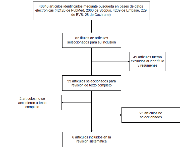 El investigador principal realizó la búsqueda bibliográfica con las palabras clave en cada una de las bases de datos previamente indicadas obteniéndose un total de 48 646 publicaciones hasta el 12 de agosto de 2020, a partir de ese número se hizo una revisión de títulos para seleccionar un total de 82 artículos para la revisión de títulos y resúmenes (figura 1).