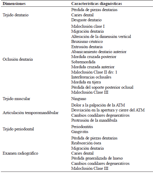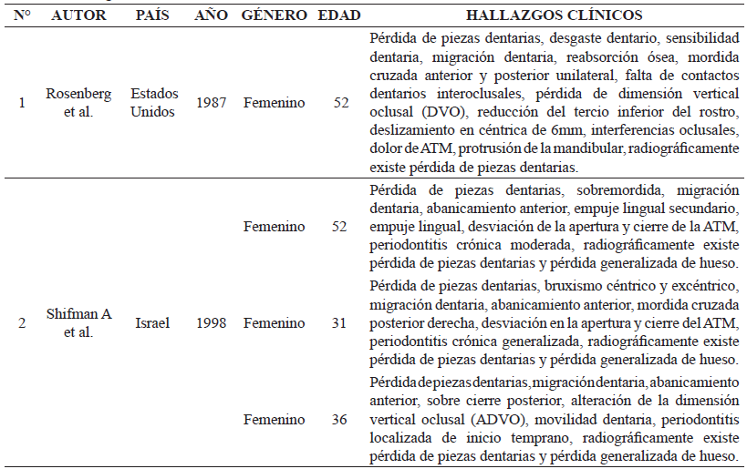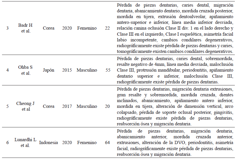 Con los hallazgos clínicos de cada artículo se consolidaron las características clínicas según las dimensiones: tejido dentario, oclusión dentaria, tejido muscular, articulación temporomandibular (ATM), tejido periodontal y examen radiográfico; hallándose como principales características la pérdida de piezas dentarias, maloclusión, desviación en la apertura y cierre del ATM, periodontitis y reabsorción ósea (tabla 6).