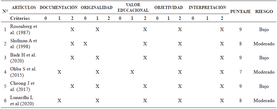 En la evaluación de riesgo de sesgos esta etapa también se realizó por pares, evaluándose primero el cumplimiento de criterios de redacción de los reportes de caso siguiendo las recomendaciones de la guía Case Report (CARE) que estandariza los puntos de una adecuada redacción (7,10) y seguidamente el riesgo de sesgos siguiendo la metodología de Pierson DJ (7,11), para caracterizar clínicamente el colapso posterior de mordida en ambas evaluaciones se obtuvieron un coeficiente de Kappa de 0.76 para CARE y 0.70 para la evaluación de riesgo de sesgos, de igual forma, las discrepancias fueron resultas por el investigador principal. La revisión de sesgos permitió otorgar un puntaje a los artículos, aquellos que tienen un puntaje de 9 a 10 indican un artículo que contribuye a la literatura (riesgo bajo), un puntaje de 6 a 8 indica que el lector debe ser cauteloso con la validez del reporte (riesgo moderado) y un puntaje de 0 a 5 es un reporte insuficiente para ser considerado válido (riesgo alto).