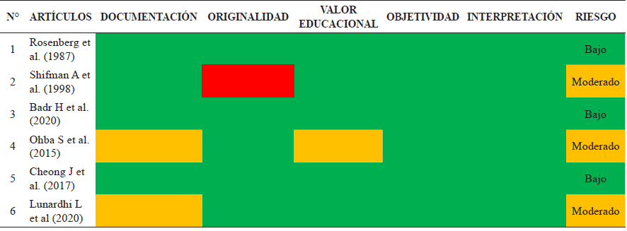 De la evaluación de riesgo de sesgos, ninguno de los artículos presentó riesgo alto, 3 (50,00%) presentaron riesgo moderado y 3 (50,00%) fueron de riesgo bajo; por ello, se decide revisar los 6 artículos para el análisis correspondiente a la caracterización clínica del colapso posterior de mordida. Se emplearon los colores para determinar los niveles de riesgo: rojo para alto, naranja para moderado y verde para bajo (tabla 4 y tabla 5).