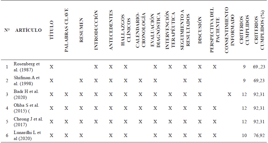 De la evaluación del cumplimiento de criterios de redacción de los reportes de caso siguiendo las recomendaciones CARE, 6 (100,00%) de ellos cumplían la mayoría de los criterios; sin embargo, ninguno de los artículos cumplió con todos los criterios considerados, en total corresponden a 8 casos descritos (tabla 3).