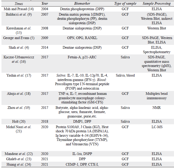Kereshanan et al. fulfilled a research to quantify the concentration of DMP-1 and dentin sialoprotein, released in the GCF during physiological and orthodontic induced root resorption. The samples were analyzed using an immunoassay (Western Blot). Dentin sialoprotein was elevated at sites that were undergoing physiological resorption compared to non-resorbed controls (p<0.05). The results highlight the potential to measure this protein in the GCF as a biomarker to monitor root resorption (15).