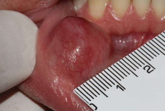 Both cases have similar clinical features. Increased smooth surface volume is observed, varying its color and consistency according to the size and depth of the lesion, which is bluish in color, transparent or similar to the mucosa. The size, on average, ranges from 0.3 cm to 2.2 cm. It often regresses spontaneously, but it recurs in most cases (2,3).