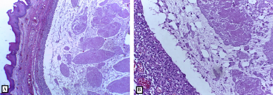 Histopathological analysis showed the presence of cavities containing amorphous and eosinophilic material in the subepithelial region compatible with mucus. Numerous inflammatory cells, including numerous foamy macrophages, were associated with mucus. The lesion area was surrounded by fibrous connective tissue and covered by parakeratinized stratified squamous epithelium, both with normal appearance (figure 3 (A and B)), and the diagnosis of MEP was established