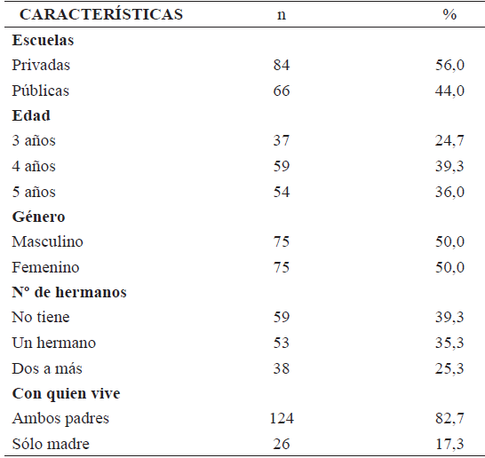 Se evaluaron 150 niños de los cuales 66 fueron de escuelas públicas rurales (44%) y 84 a escuelas privadas urbanas (56%). La edad de mayor frecuencia fue 5 años (36%), respecto al género se obtuvo la misma proporción de niños y niñas en ambos tipos de escuela. Las características sociodemográficas demuestran que la mayoría son hijos únicos (39%), viven con ambos padres (82,7%), las familias tienen un ingreso mensual menor a 1400 nuevos soles (40%), que se observa en la tabla 1.