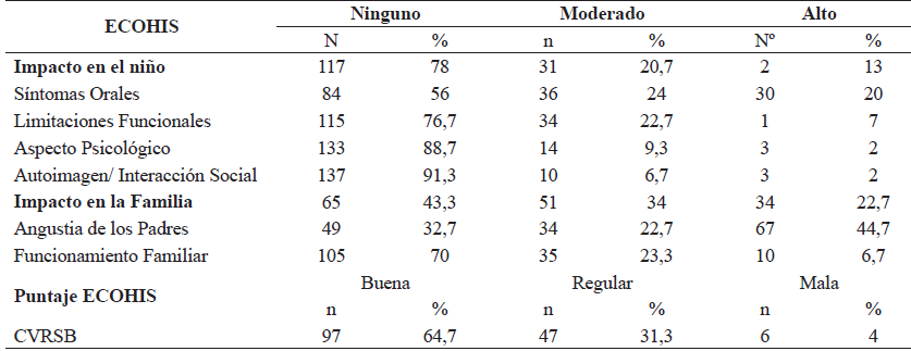El cuestionario ECOHIS fue respondido por el padre y/o madre y/o tutor del preescolar, obteniendo en la sección impacto en el niño mayores respuestas en el dominio síntomas orales (20%), seguido de limitación funcional (7%). En la sección impacto en la familia, el dominio con mayor impacto negativo fue angustia de los padres (44,7%). Referente a la CVRSB, de acuerdo al puntaje del ECOHIS, se subdividió en calidad de vida buena (64,7%), regular (31.3%) y mala (4%) (tabla 2).