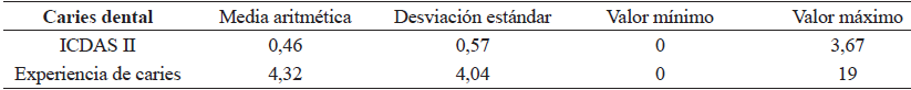 Respecto a la experiencia de caries, los preescolares presentaron en media 4,32 lesiones cariosas y según el ICDAS II con una severidad de progresión leve en media de 0,43 (tabla 3). Mientras que el trauma dental sólo fue observado en 5,3% de los preescolares (tabla 4).