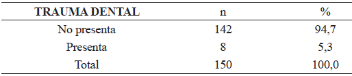 En el presente estudio, el trauma dental se registró en menor frecuencia (5,3%), en otros estudios, se reporta una frecuencia relativamente similar (2,9,17), debido al procedimiento durante el examen clínico con observación visual, que puede subestimar la presencia de traumas dentales porque no se usó el examen radiográfico. Otras investigaciones realizadas en Brasil, hallaron mayor frecuencia de trauma dental (18,19). Esta variación puede deberse a las diferencias en el método de recolección de datos, selección de muestra o lugar donde se realizó el estudio.