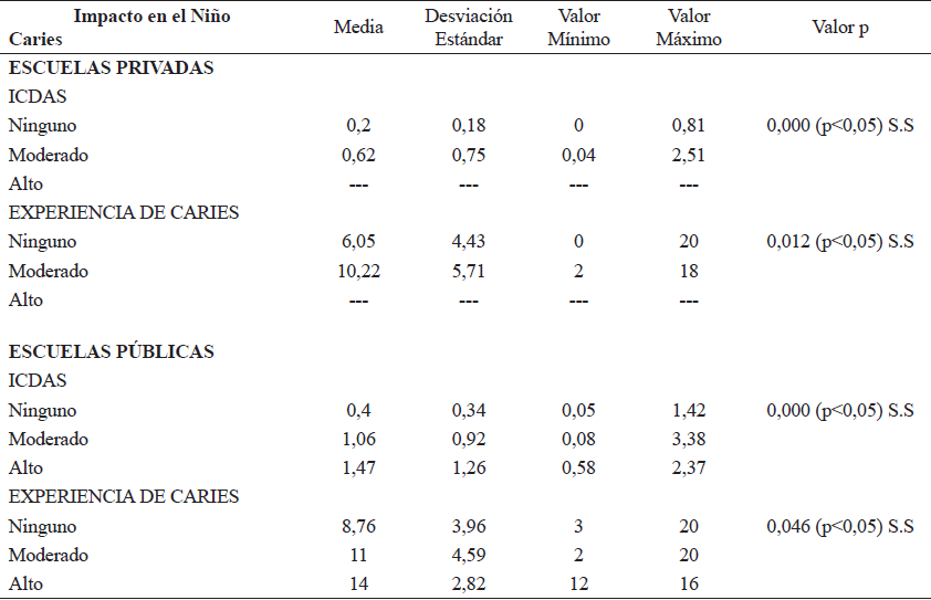 El análisis de correlación de la CPI con el ECOHIS en la sección impacto en el niño, según el ICDAS II, determinó que los preescolares de escuelas públicas rurales tienen un impacto negativo de 1,47 y un promedio de 14 lesiones de caries según la experiencia de caries. Mientras que los preescolares de escuelas privadas urbanas no presentan impacto negativo alto, sin embargo, es necesario distinguir aquellos que presentan impacto negativo moderado respecto a la progresión de la lesión de caries y experiencia de caries teniendo en promedio 0,62 y 10,22 respectivamente (tabla 5).