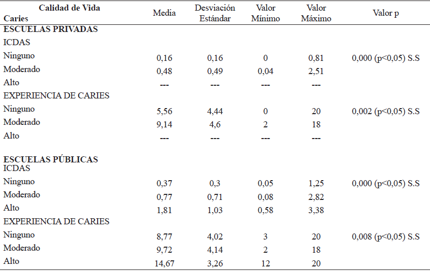 En el análisis de correlación de la CPI con la calidad de vida en preescolares de escuelas públicas urbano marginales, los padres que declararon tener mala calidad de vida, tienen hijos que presentan en promedio 1,81 de progresión de caries según ICDASS II y 14,67 en experiencia de caries. Los padres de preescolares de escuelas privadas urbanas indican no tener mala calidad de vida (tabla 7).