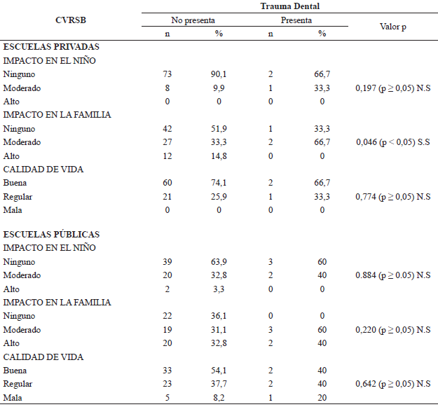 En relación al trauma dental, solo tuvo significancia el dominio familiar de preescolares de escuelas privadas urbanas, no se encontró asociación con impacto negativo en preescolares de escuelas públicas urbano marginales y en general en la CVRSB. Algunos autores afirman que lesiones traumáticas complicadas si tienen impacto negativo en la CVRSB (20,21), sobre todo en los padres y/o cuidadores, los traumas con exposición del tejido pulpar puede demandar más tiempo a la familia a tener en cuenta por los síntomas producidos.