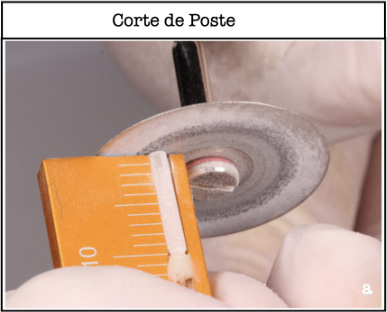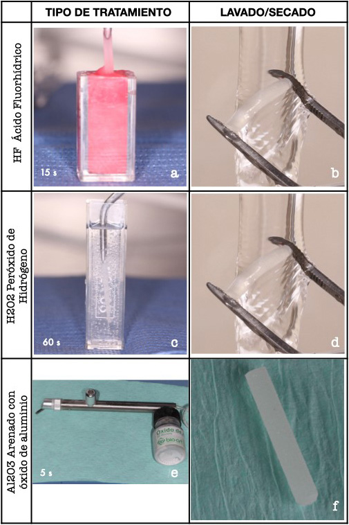 Para el acondicionamiento de superficie con HF 10%, se utilizó una caja de cono de papel; el poste estuvo completamente sumergido en el agente de tratamiento durante 15s, luego se lavó con agua corriente por 30s y se secó con aire. Para el acondicionamiento de superficie con H2O2 24%, se colocó el poste en una caja de cono de papel completamente sumergido por 60s, luego se lavó con agua corriente por 60s y se secó con aire. Para el acondicionamiento de superficie con partículas de Al2O3 50 µm, se colocó el poste en un dispositivo de silicona de manera vertical, la boquilla del microarenador se colocó perpendicular al poste a una distancia de 10 mm, durante 5 segundos (figura 1 y figura 2). Durante el procedimiento, el poste giró de manera que las partículas de óxido de aluminio atacaron en toda su superficie. Después del arenado se aplicó aire para eliminar el exceso de partículas (5).