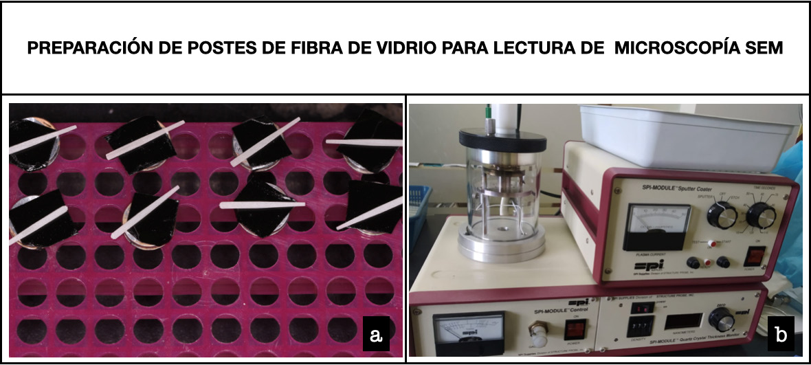 La presente investigación fue experimental in vitro, la muestra estuvo conformada por 80 postes de fibra de vidrio, divididos en dos grupos de dos casas comerciales; se denominó P1: ® FGM White Post DC y P2: ® MAQUIRA Fiber Post. Cada grupo fue subdividido en 4 subgrupos de 10 postes para realizar los diferentes acondicionamientos de superficie de la siguiente forma: T1: control; T2: acondicionado con Ácido Fluorhídrico (HF) al 10% ® Condac Porcelana (FGM) por 15s; T3: acondicionado con Peróxido de Hidrógeno (H2O2) al 24% (Delta Química - Insumos químicos) por 60s; T4: acondicionado con partículas de Óxido de Aluminio (Al2O3) de 50µm (® Zhermarck),5s cada cara del poste a 2b de presión y una distancia de 10mm. Se incluyó postes con diferentes lotes, postes de diámetro #1, presentación de caja sellada, forma del poste cilíndrica-cónica, y se excluyó postes dañados, postes de diámetro #0.5, #2 y #3, postes de cuarzo y carbono.