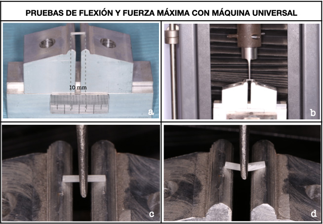 Una vez obtenido los valores de las variables de fuerza máxima y de deflexión (figura 5), se obtuvo el promedio y desviación estándar de cada grupo de estudio posteriormente a ello, se evaluó la diferencia estadística de cada uno de los valores obtenidos para ello se procedió primero a identificar la normalidad de los datos, mediante la prueba de Shapiro Wilk. Se obtuvo datos normales, se empleó la prueba de Anóva y la prueba Post Hoc de Tuckey. El estudio contó con un nivel de confianza de 95% y P<0,05. Se empleó el programa estadístico SPSS v.24.0.