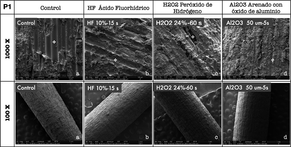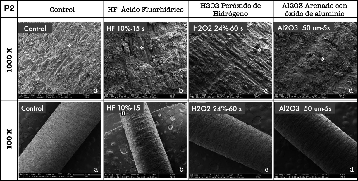 EL estudio con diferentes acondicionamientos de superficie del poste de fibra de vidrio utilizando HF, H2O2 y AL2O3, encontró efectos adversos sobre las propiedades de flexión, para White Post DC y MAQUIRA Fiber post. De la misma forma las imágenes SEM de la microtopografía mostró diferencias entre los acondicionamientos probados.