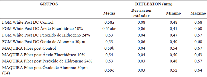 Para los resultados de deflexión (mm) de ® FGM White Post DC se encontró diferencia estadísticamente significativa entre T1 y T2 (p<0,05). Mientras que ® MAQUIRA Fiber Post, no se encontró diferencia estadísticamente significativa (p<0,05). Comparando ambas marcas ® FGM White Post DC y ® MAQUIRA Fiber post, se encontró diferencia estadísticamente significativa entre T1 ® FGM White post DC y T2 ® FGM White Post DC (p<0,05), así mismo entre T2 ®FGM White post DC y T1 ® MAQUIRA Fiber post (p<0,05), y también entre T2 ® FGM White Post DC y T4 ® MAQUIRA Fiber post (T4) (p<0,05) (tabla 1).