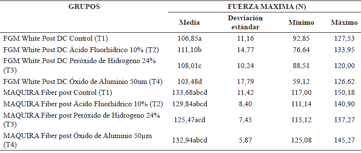 Para los resultados de fuerza máxima (N) de ® FGM White Post DC no se encontró diferencia estadísticamente significativa (p<0,05). Mientras que ® MAQUIRA Fiber Post se encontró diferencia estadísticamente significativa entre todos los subgrupos (T1, T2, T3 y T4) (p<0,05). Comparando ambas marcas ® FGM White Post DC y ® MAQUIRA Fiber post, se encontró diferencia estadísticamente significativa entre T1 ® FGM White post DC y T1, T2, T3, T4 de ® MAQUIRA Fiber post (p<0,05), así mismo en T2 ® FGM White post DC y T1, T2, T4 de ® MAQUIRA Fiber post (p<0,05), como también en T3 ® FGM White post DC y T1, T2, T3, T4 de ® MAQUIRA Fiber post (p<0,05), y de la misma forma entre T4 ® FGM White post DC con T1, T2, T3, T4 de ® MAQUIRA Fiber post (p<0,05) (tabla 2).