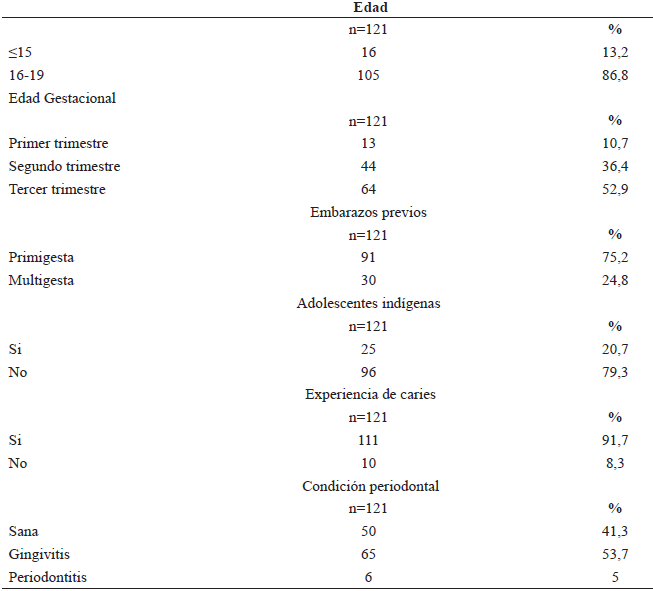 Las adolescentes embarazadas que participaron en el estudio tuvieron una media de edad de 17,21±1,443 años. El 86,8% tenían entre 16 y 19 años y un 13,2% 15 años o menos (tabla 1), siendo la edad inferior 14 años. El 20,7% de las embarazadas adolescentes se auto identificaron como indígena y el 79,3% no pertenecen a ninguna etnia indígena. Del total de 121, el 91,7% tienen experiencia de caries frente a un 8,3% que no reflejaron experiencia de caries. Respecto a la condición periodontal, el 41,3% de las adolescentes embarazadas mostraron condición sana, un 53,7% tenían gingivitis y el 5% presentaron periodontitis. Los valores del Índice de dientes cariados, obturados y perdidos (CPO) y del Índice significativo de caries (ISC) se presentan en la tabla 2. El CPO de las embarazadas adolescentes fue de 6,84±4,173 dientes y el ISC, la media fue de 11,42±2,374.