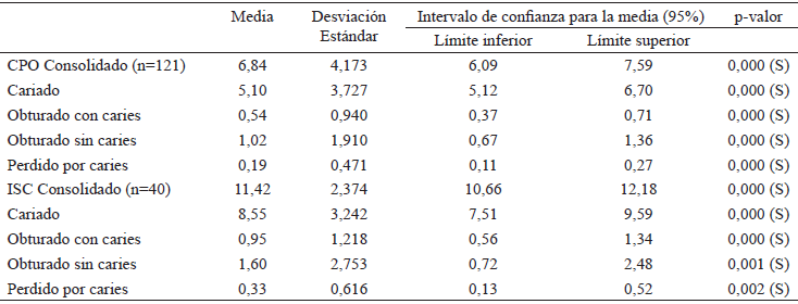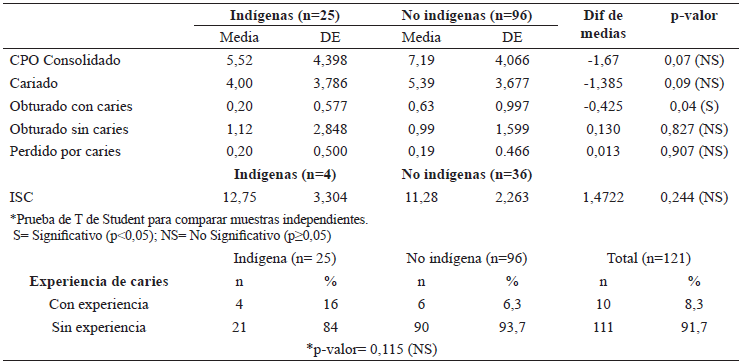 En la tabla 3 se presentan los resultados para el CPO y ISC comparando a las adolescentes embarazadas indígenas con las no indígenas, así como la experiencia de caries en uno y otro grupo. El índice CPO fue más alto en el grupo de no indígenas con un 7,19±4,066 en comparación con un 5,52±4,398 para el grupo de embarazadas adolescentes indígenas. Sin embargo, la diferencia estadística no es significativa (p=0,07). En ambos casos, el componente principal fue dientes cariados, siendo sus valores promedio 4,00±3,786 para el grupo de indígenas mientras que el grupo de no indígenas presentó 5,39±3,677, al comparar la diferencia entre ambas medias la diferencia no tuvo significancia estadística (p= 0,09). Respecto al ISC, el valor más alto correspondió al grupo de indígenas con una media de 12,75±3,304 y el grupo de no indígenas tuvo 11,28±2,263 dientes con experiencia de caries. La experiencia de caries fue de 93,7% para las no indígenas y de 86% para las embarazadas adolescentes indígenas.