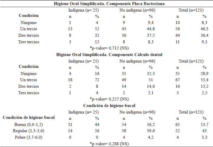 En la tabla 4 se muestran los datos del Índice de Higiene Oral Simplificada (IHO-S) en sus componentes placa bacteriana y cálculo dental. La mitad de las embarazadas indígenas presentaron placa bacteriana en un tercio de la corona clínica del diente, en el 32% de ellas se observó placa en dos tercios y en el 12% en los tres tercios. Para el grupo de embarazadas no indígenas el 44,8% tenían placa en un tercio de la corona, un 37,5% en dos tercios y el 8,3% en los tres tercios. Al aplicar la prueba de independencia chi cuadrado la diferencia observada resultó no significativa (p = 0,712). Respecto al componente cálculo dental, el 72% de las embarazadas indígenas tuvo cálculo en un tercio de la corona. Mientras que, entre las no indígenas la mitad presentaron cálculo en un tercio. La diferencia observada no fue estadísticamente significativa (p =0,227). La condición de higiene bucal fue buena para el 53,7% de todas las embarazadas, regular para el 43% y pobre para el 3,3%. Al diferenciar las embarazadas indígenas de las no indígenas, en las primeras la condición que predominó fue regular con un 56% y 44% para la condición buena, se resalta que ninguna tuvo condición de higiene bucal pobre; en cambio en las segundas, la higiene bucal fue buena en el 56%, regular en el 39,6% y pobre para el 4%.