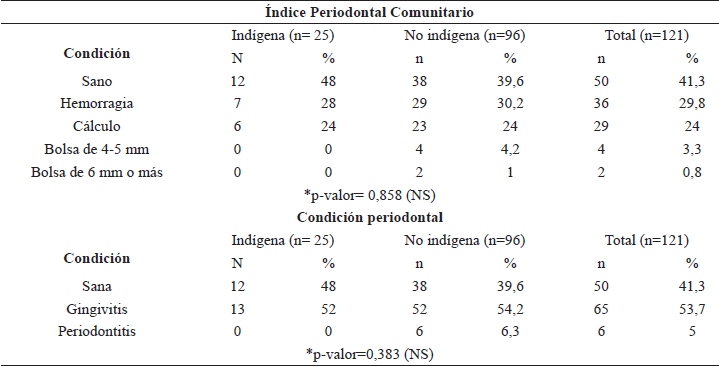 Para cálculo, ambos grupos obtuvieron un 24%; y para la condición bolsa periodontal, en cualquiera de las dos profundidades que establece el índice, solo el grupo de embarazadas adolescentes no indígenas presentó casos, un total de 6 que representaron un 5% dentro del grupo. Respecto a la condición periodontal consolidada, el 52% del grupo de indígenas presentó gingivitis y el resto resultó sano. Mientras que, en el grupo de no indígenas el 54% presentó gingivitis, el 6% tenían periodontitis y el 40% estaban sanas. No se observó diferencia estadísticamente significativa para la condición periodontal de ambos grupos.