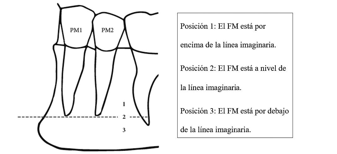 El estudio de la posición vertical del FM se realizó en la reformación tridimensional ubicándolo en relación con una línea imaginaria que une los ápices de los dos premolares inferiores tomada de Zmyslowska-Polakowska (5) (figura 2).