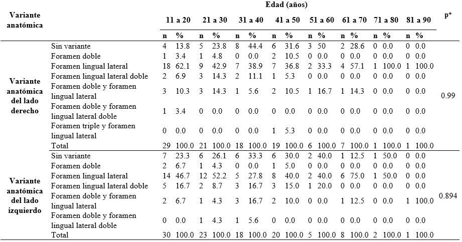 En conclusión, la posición horizontal del foramen mentoniano más frecuente fue entre el primer y segundo premolar. La posición vertical del foramen mentoniano más común fue por debajo de la línea imaginaria de los premolares. Las formas ovaladas con predominio horizontal y redondeada fueron las de mayor porcentaje. El foramen lingual lateral fue la variante anatómica que se encontró en mayor número. No se encontró asociación estadísticamente significativa según el sexo, edad y lado con ninguna de las variables.
