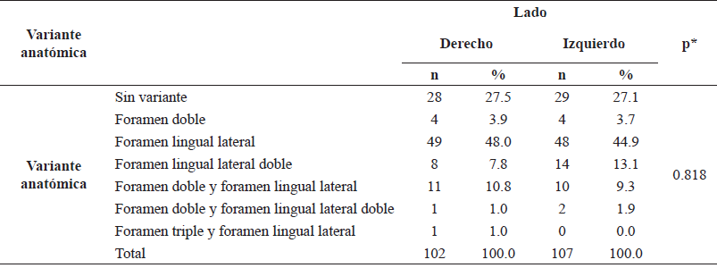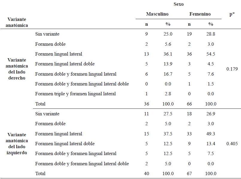 Se evaluó un total de 117 volúmenes de TCHC, de los cuales 43 (36,75%) fueron del sexo masculino y 74 (63,25%) del sexo femenino. Se estudió un total de 209 FM, 102 (48,80%) del lado derecho y 107 (51,20%) del lado izquierdo. La distribución por edades fue heterogénea, se evaluaron 33 pacientes en el grupo etario de 11 a 20 años (28,21%), 23 en el grupo de 21 a 30 años (19,66%), 20 en el grupo de 31 a 40 años (17,09%), 23 en el grupo de 41 a 50 años (19,66%), 7 en el grupo de 51 a 60 años (5,98%), 8 en el grupo de 61 a 70 años (6,84%), 2 en el grupo de 71 a 80 años (1,71%) y 1 paciente en el grupo de 81 a 90 años (0,85%). La posición horizontal del FM más frecuente fue la posición 3 (entre el primer y segundo premolar), no se encontraron forámenes en la posición 1 y 6 en ningún caso. En cuanto a la posición vertical del FM, la posición 3 (por debajo de la línea imaginaria entre los ápices de los premolares) fue la más común, no encontrándose ninguno en la posición 1 (tabla 1). En relación a la posición horizontal tanto para el lado derecho e izquierdo, en el sexo masculino y femenino, la más frecuente fue la posición 3 (tabla 2). Al relacionar la posición vertical, en ambos sexos y tanto para el lado derecho e izquierdo, la más común fue la posición 3 (tabla 2). En cuanto a la relación de la posición horizontal del lado derecho y la edad, la posición 4 fue la más común en la mayoría de grupos etarios. En el lado izquierdo, la posición 3 fue la más frecuente en la mayoría de grupos (tabla 3). En relación con la posición vertical y la edad, tanto para el lado derecho e izquierdo, la posición 3 fue la más frecuente en todos los grupos etarios (tabla 3). Según la frecuencia de la posición horizontal y el lado, tanto en el lado derecho como el izquierdo, la más frecuente fue la posición 3. En la frecuencia de la posición vertical y el lado, la posición 3 fue la más común tanto para el lado derecho e izquierdo (tabla 4). Al evaluar la forma del FM del lado derecho con el sexo, la más frecuente tanto para el sexo masculino y femenino fue la forma redondeada. En el lado izquierdo, la más frecuente para el sexo masculino fue la forma ovalada con predominio horizontal y para el sexo femenino, la más frecuente fue la forma redondeada (tabla 5). En relación con la forma del FM del lado derecho y la edad, la forma redondeada fue la más frecuente en la mayoría de grupos etarios. En el lado izquierdo, la forma ovalada con predominio horizontal fue la más común en la mayoría de grupos (tabla 6). Según la frecuencia de la forma del FM y el lado, en el lado derecho la más frecuente fue la forma redondeada. Para el lado izquierdo, las formas más frecuentes fueron la ovalada con predominio horizontal y la redondeada (tabla 7). En cuanto a las variantes anatómicas, en el lado derecho e izquierdo y tanto para el sexo masculino y femenino, la más frecuente fue la presencia del FLL (tabla 8). Al estudiar las variantes anatómicas del lado derecho y la edad, el FLL fue la más común en la mayoría de grupos etarios, lo mismo que se repitió en el lado izquierdo (tabla 9). Según la frecuencia de las variantes anatómicas y el lado, en el lado derecho e izquierdo la más frecuente fue el FLL (tabla 10).