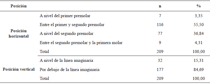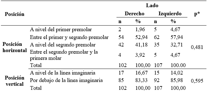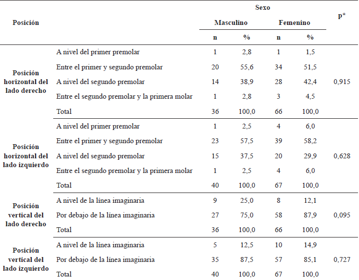 La posición horizontal del FM más frecuente fue la posición 3 en ambos sexos, tanto para el lado derecho como para el lado izquierdo, esto a diferencia de la mayoría de estudios, como los de Cabanillas Padilla (1), Zhang (3), Zaman (4), Alam (8), Rodríguez Cárdenas et al., (11) y Delgadillo Avila (15), quienes encontraron que la posición más común era la posición 4, sin embargo este estudio coincide con los hallazgos de Zmyslowska-Polakowska (5), Krishnan (17) y de Voljevica (9), quienes obtuvieron que la posición más común en el lado izquierdo era también entre el primer y segundo premolar y con Gungor (12), quien encontró que era la posición más frecuente en el sexo femenino. Esta variedad de resultados puede deberse a la diversidad étnica presente en las muestras de los estudios señalados.