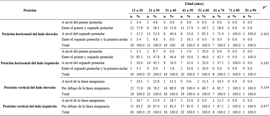 En cuanto a la posición vertical del FM, en todos los grupos etarios, ambos sexos y lados, se halló en mayor porcentaje la posición 3, coincidiendo con lo encontrado en los estudios de Zhang (3), Zaman (4), Zmyslowska-Polakowska (5) y Alam (8).