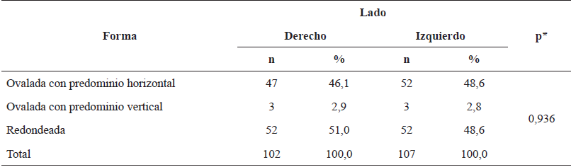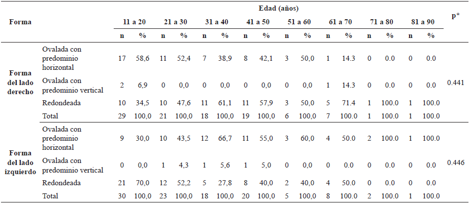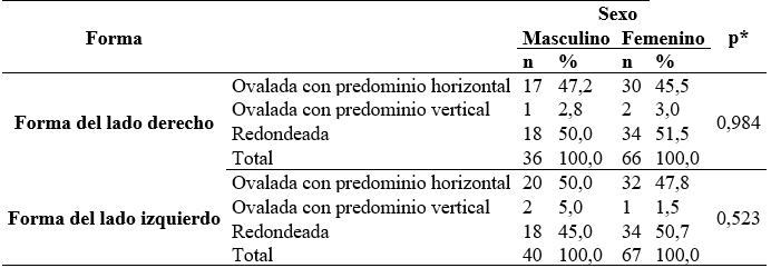 En el presente estudio, la forma del FM tuvo porcentajes muy parecidos entre la ovalada con predominio horizontal y la redondeada, siendo esto similar a lo visto por Zhang (3) y Zmyslowska- Polakowska (5). Cabe resaltar que la metodología utilizada fue la misma que la de los mencionados autores. A diferencia de lo expuesto por Cabanillas Padilla (1) y Sánchez Mateus (13), quienes obtuvieron un alto porcentaje para la forma ovalada y por Alam (8), quien expuso una mayor ocurrencia de la forma redondeada. Esto podría deberse a que la clasificación de la forma del FM que ellos realizaron fue por observación visual.