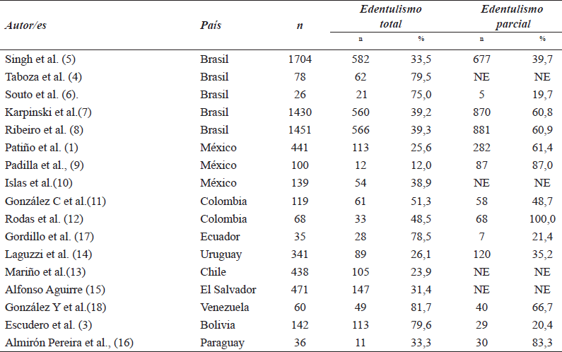 Tres investigaciones fueron realizadas en México (1,9,10). En estas se describe una prevalencia de edentulismo total que va desde el 12% (9) hasta el 38,9% (10) y parcial de 61,4% (1) a 87,0 % (9) (tabla 1).