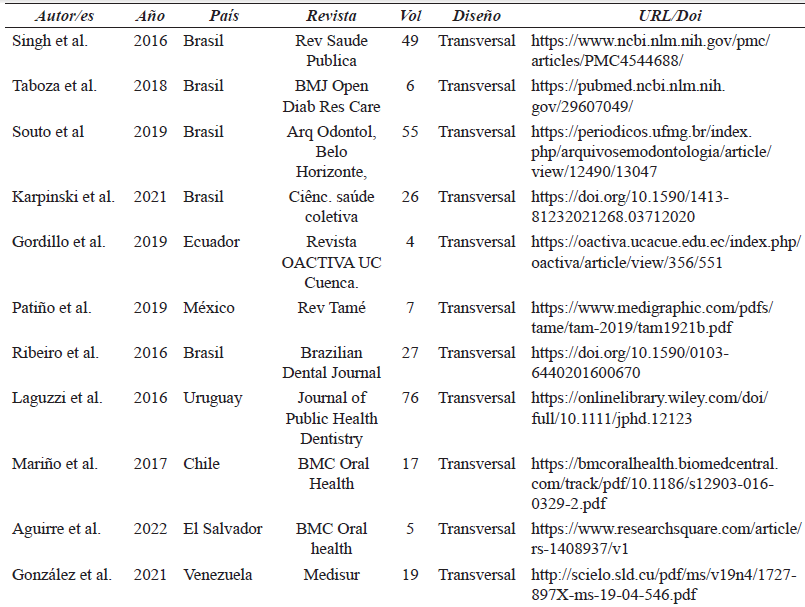 4. Taboza ZA, Costa KL, Silveira VR, et al. Periodontitis, edentulism and glycemic control in patients with type 2 diabetes: a cross-sectional study. BMJ Open Diabetes Res Care. 2018;6(1):e000453. (Citado el 15 de marzo del 2022). Disponible en: https://drc.bmj.com/content/6/1/e000453