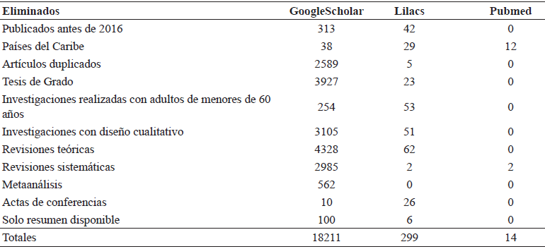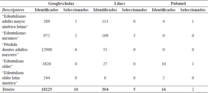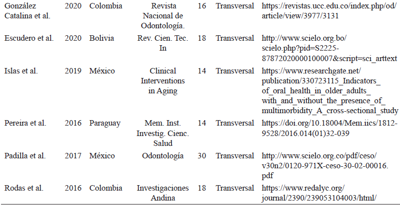 En otros países de la región los reportes de prevalencia de edentulismo total son: 23,9% en Chile (13); 26,1% en Uruguay (14); 31,4% en el Salvador (15); 33,3% en Paraguay (16); 78,5% en el Ecuador (17); 79,6% en Bolivia y 81,7% en Venezuela (18). En la tabla 1 se muestran los hallazgos sobre prevalencia de edentulismo total y parcial en las investigaciones consultadas, y en las tablas 2 y 3 se muestran la trazabilidad y la selección de los artículos incluidos en la revisión.