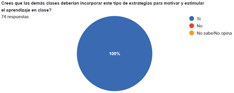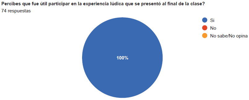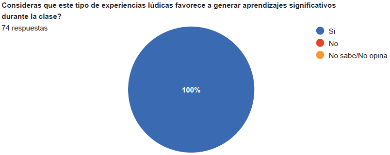 El 100 % de los alumnos percibieron que la experiencia lúdica que se presentó al final de la clase fue útil (figura 3), que la actividad genera aprendizajes significativos (figura 4) y que debería ser aplicada en otras clases para de esta forma motivar el aprendizaje (figura 5).