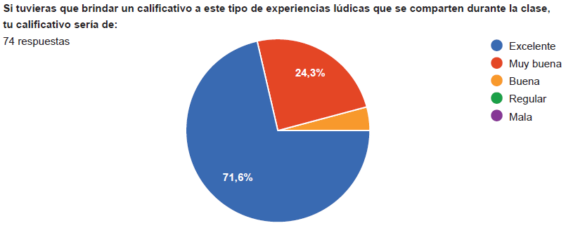 Los alumnos realizaron la experiencia en sus PC y laptops. Al finalizar se contabilizó el puntaje total, obteniendo el ranking de los participantes. Se felicitó y agradeció a los alumnos por su participación. Luego de la experiencia se aplicó una encuesta anónima y voluntaria usando la herramienta digital Google Forms para conocer la percepción de los alumnos sobre la actividad. Finalmente, los resultados de esta encuesta fueron compartidos a través de la aplicación WhatsApp.