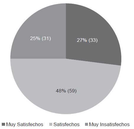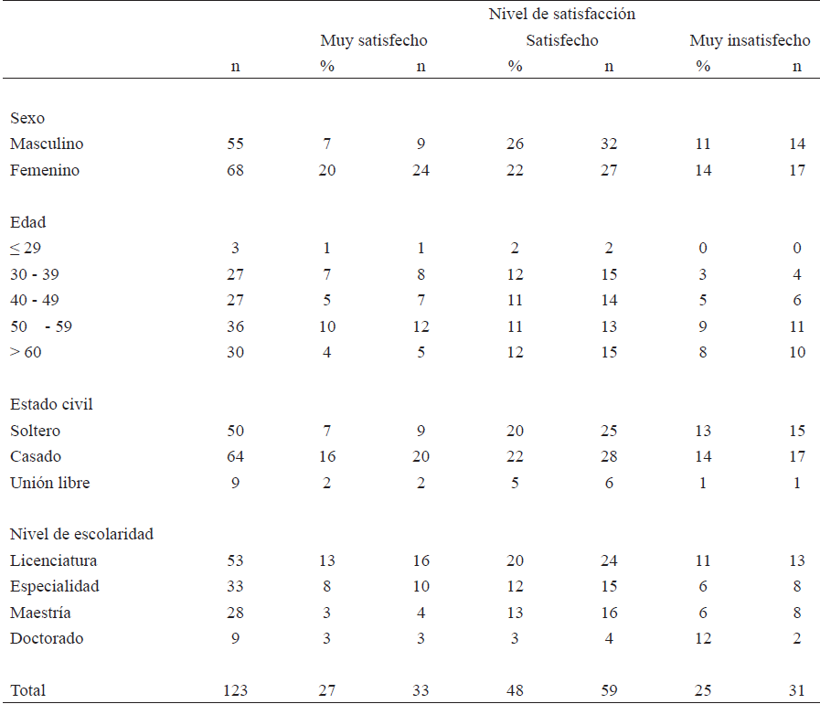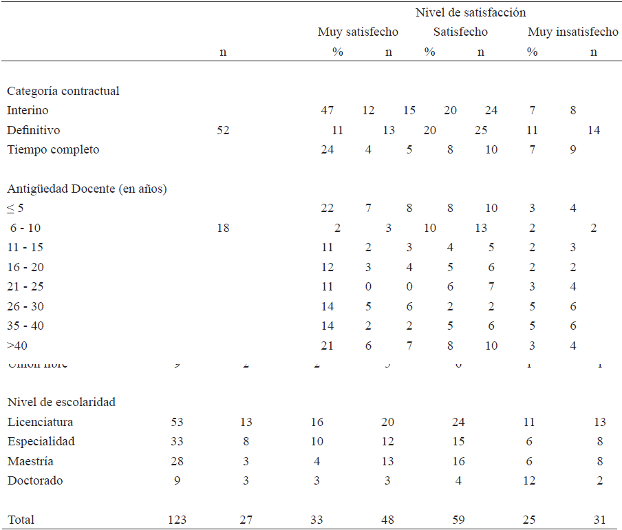 Se observó que el 25% (31) de los participantes se encuentran muy insatisfechos, 27% (33) muy satisfechos y 48% (59) satisfechos (Figura 1). En relación a las características de los docentes, el 55% (68) son del sexo femenino: la edad que predomina en la muestra, se encuentra en el rango 50 a 59 años con un 30% (36), el estado civil de la población con predomino son casados con 52% (64), y el nivel de escolaridad con mayor frecuencia es el de licenciatura 43% (53) (Tabla 1). El 42% (52) corresponde a profesores definitivos, 39% (48) a profesores de 11 a 30 años de antigüedad, 56% (69) pertenece a horario mixto, el 49% (60) ejerce la docencia en el área cínica, el 54% (66) considera injusto el sueldo que percibe, 46% (57) indica que siempre cuenta con instalaciones adecuadas, 52% (64) considera que siempre existe capacitación por parte de la institución, 46% (56) apunta a que siempre cuenta con permiso para capacitación externa; 85% (104) reportó contar con autonomía laboral y el 41% (50) dice tener oportunidad de ascenso (Tabla 2).