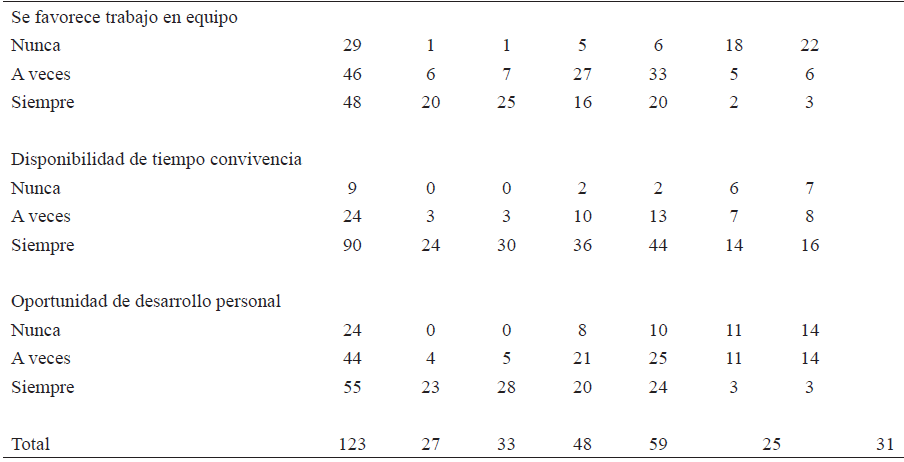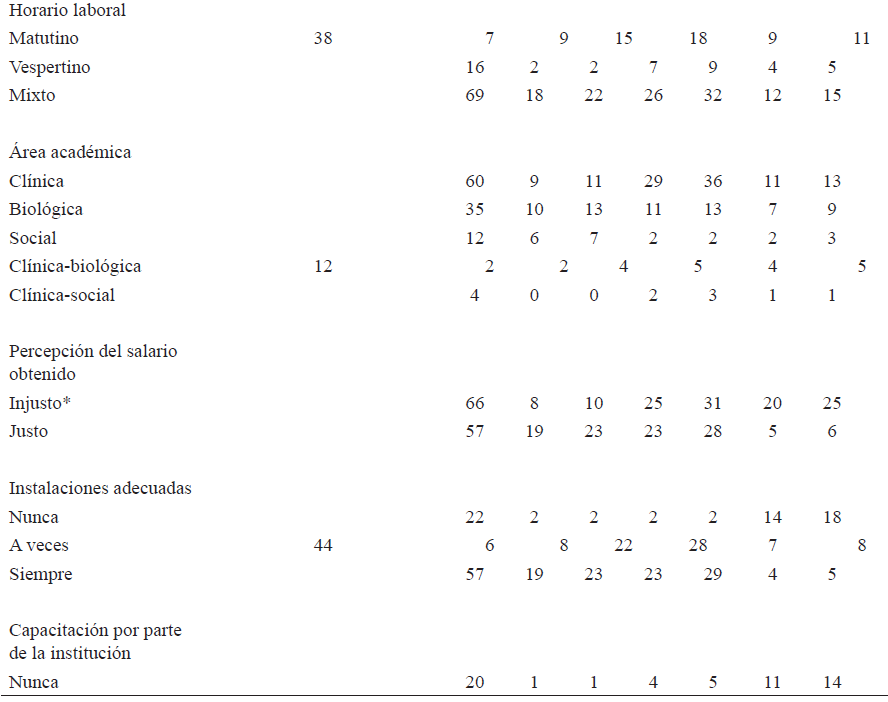 Existen factores que influyen en el conflicto trabajo-familia, como es el tiempo de convivencia familiar, en un estudio realizado por Padilla(10), con el propósito de estudiar la corresponsabilidad familiar, el apoyo organizacional y la satisfacción laboral percibida hacia la familia –en relación a la presencia y ausencia de estrategias que convengan a la vida familiar y laboral–, los resultados muestran que, la conciliación trabajo-familia tiene una percepción media del apoyo otorgado por la empresa, coincidencia con los resultados de esta investigación, donde el 73% (90) de los docentes, indicó que existe disponibilidad para la convivencia familiar en el trabajo que desempeñan. Así mismo, dentro de su investigación, explica que la profesión docente como parte de un mercado laboral, tiene procesos de contratación, que puede ser temporal (asignatura) o fijo (definitivo), factores que repercuten en la satisfacción laboral, ya que a menor estabilidad menor satisfacción laboral, sus resultados con esta investigación no coinciden, debido a que tanto académicos definitivos como interinos de la FES Zaragoza se encuentran medianamente satisfechos.