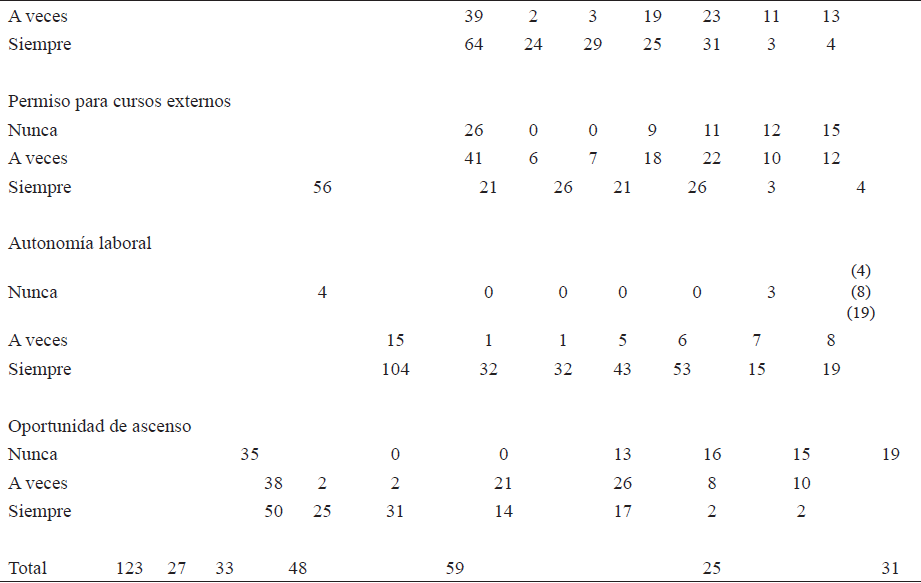 Sánchez y García(8), indican que, al investigar la relación de la satisfacción laboral con respecto a la capacitación de dos empresas, los trabajadores en ambas se encuentran satisfechos, coincidiendo con nuestra investigación en la que siempre existe capacitación por parte de la Facultad y con una tendencia de muy satisfechos a satisfechos.