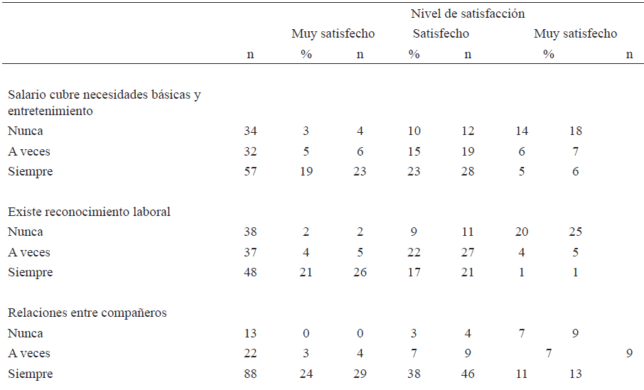 Son diversos los factores que fomentan la satisfacción laboral, entre ellos, el reconocimiento del valor humano, las capacidades del trabajador para avanzar y conseguir logros proveniente de sus compañeros y jefes, la posibilidad de avance o el apoyo percibido para su crecimiento personal y profesional dentro de la organización; factores higiénicos como, la retribución económica que le permita al trabajador satisfacer las necesidades esenciales de él y de su familia; condiciones ambientales como, nivel de ruido, índice de violencia en la zona, entre otros. Un factor que se ha observado para un alto nivel de descontento es el que se refiere al sistema de contratación y promoción (6,7). Entre las buenas condiciones de trabajo que incrementan la motivación se encuentran, el desarrollo de relaciones humanas saludables, la reafirmación de valores, creación de objetivos y metas cumplidas.