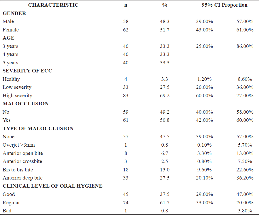 The sample (n=120) was distributed by gender, age, and oral diseases/conditions among patients such as malocclusions, the severity of ECC, and OHI-S. The female sex represented 51.7% of individuals. High severity of ECC was found in 69.2% of the participants. 50.8% of the children had some type of malocclusion and, among them, deep bite (27.5%) and bis to bis bite (15%) represented the highest percentages. The most common clinical level of oral hygiene was regular with 61.7% of patients (Table 1).
